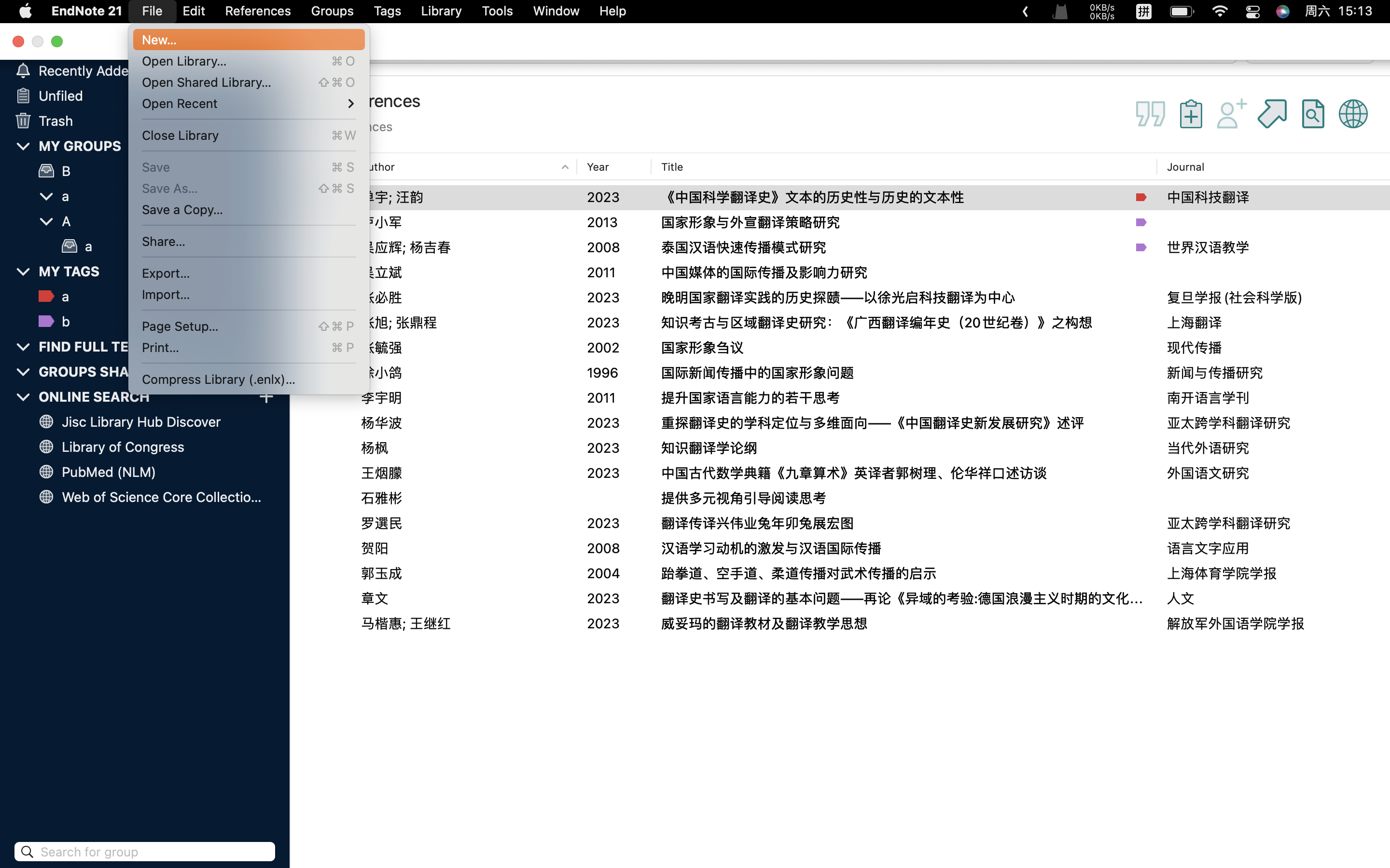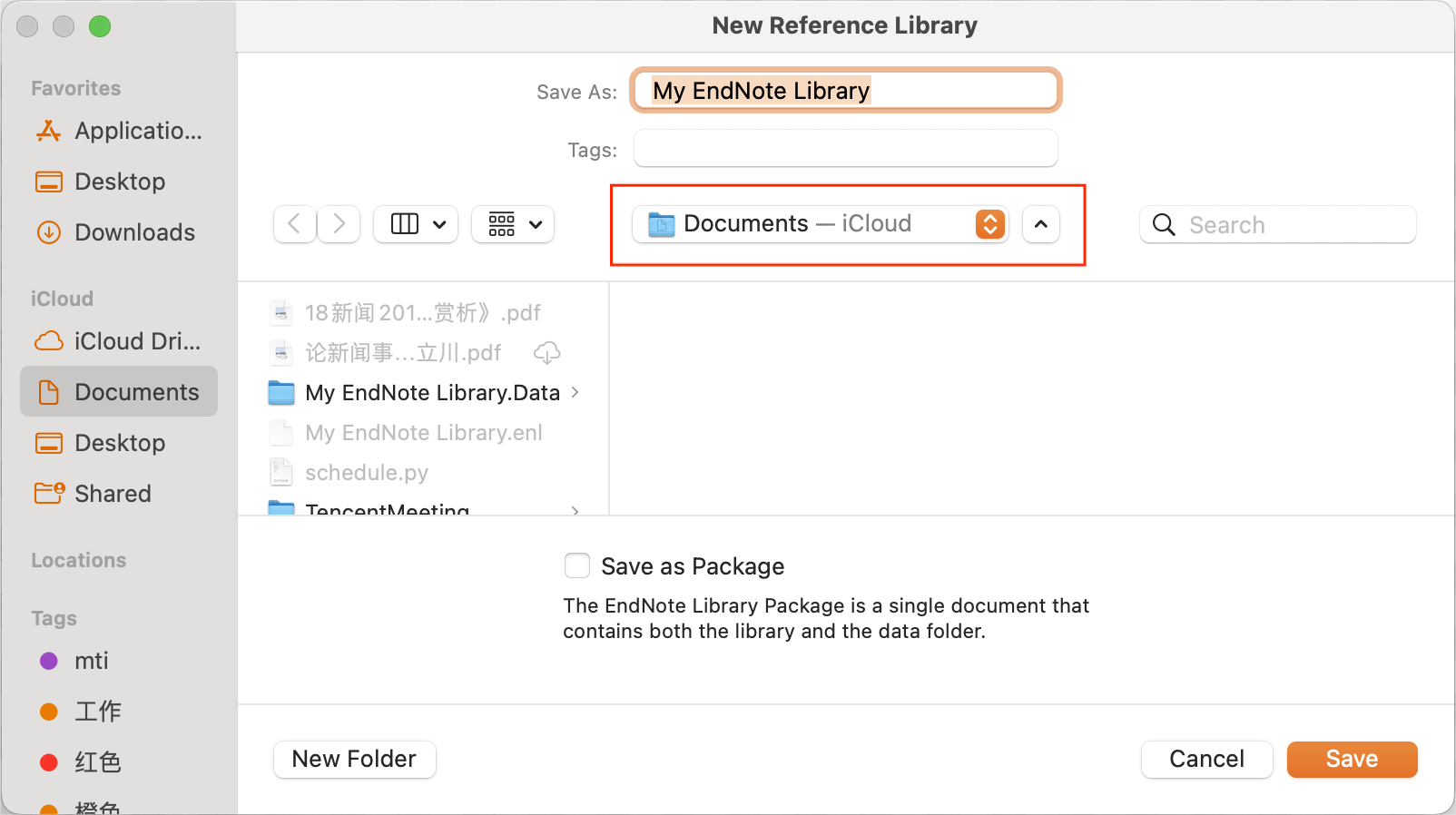 创建Library 本节将简单介绍如何新建一个Library 如图,在endnote视窗右上角点击File按钮,选择New 弹出如图对话框后,可在save as后编辑Library名称。 在图中红框所指位置选择Library储存位置。 点击右下角save,保存Library