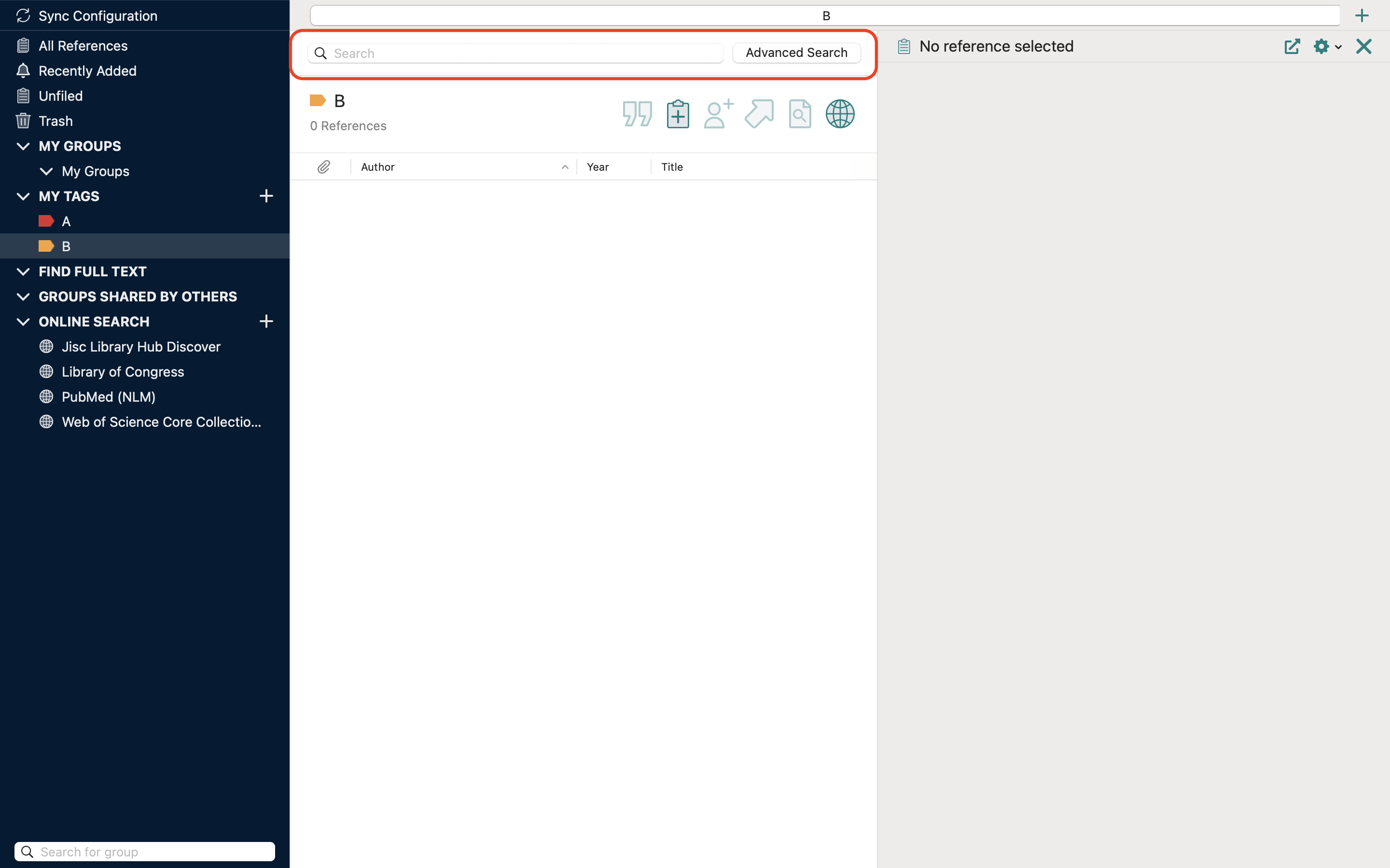 简单搜索 简单搜索文献 在左侧栏中选择想要搜索的范围,可以在All References、Recently Added、Unfiled、Group和Tag中选择; 在视图上方找到搜索框,位置如图; 在搜索输入想要检索的内容; 单击回车键,完成搜索。 简单所搜会在搜索范围内所有文献的所有部分检测关键词,并在视图中展示出来。